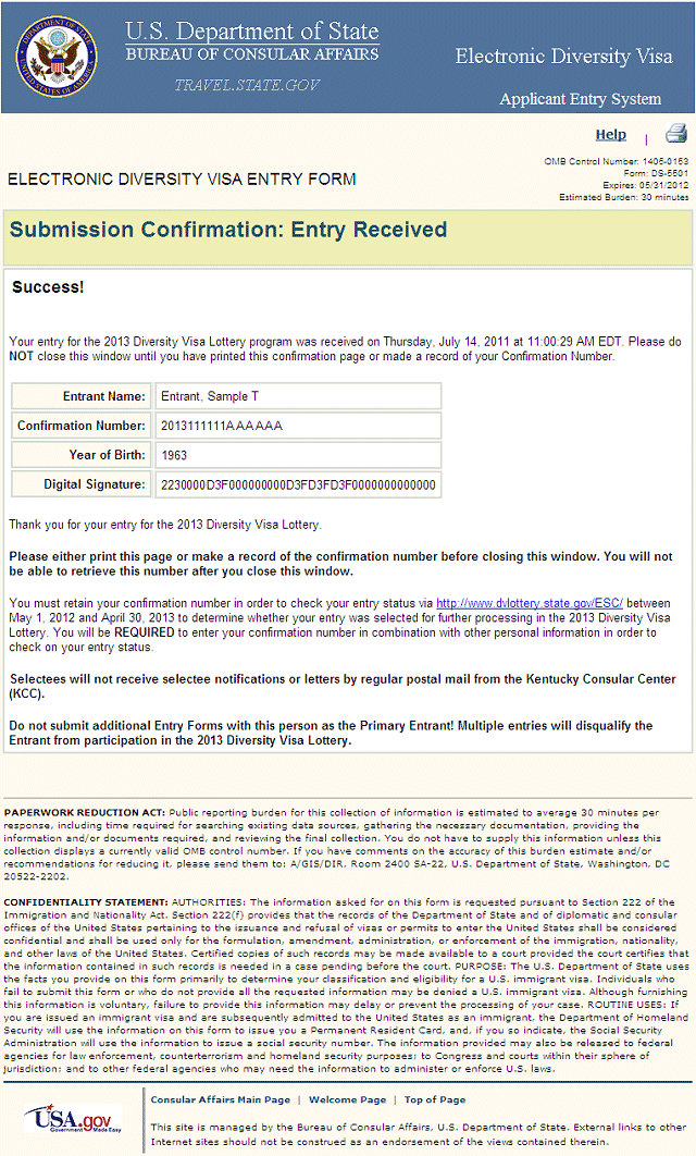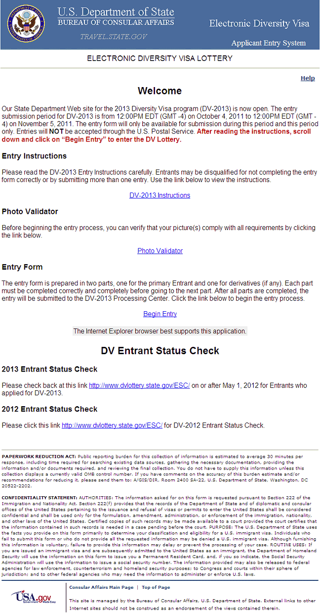 I treća opcija je Begin Entry. Klikom na ovaj link počinjete unos za dv lutriju.